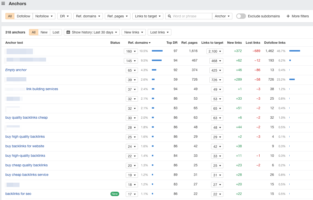 第一步是将你的网站插入 Ahrefs 的网站分析 (或其他你喜欢的反向链接检查器)并导航到锚文本(Anchors) 报告。我们最近透过各种有用的过滤器增强了该功能,现在更容易诊断与锚文本相关的问题。