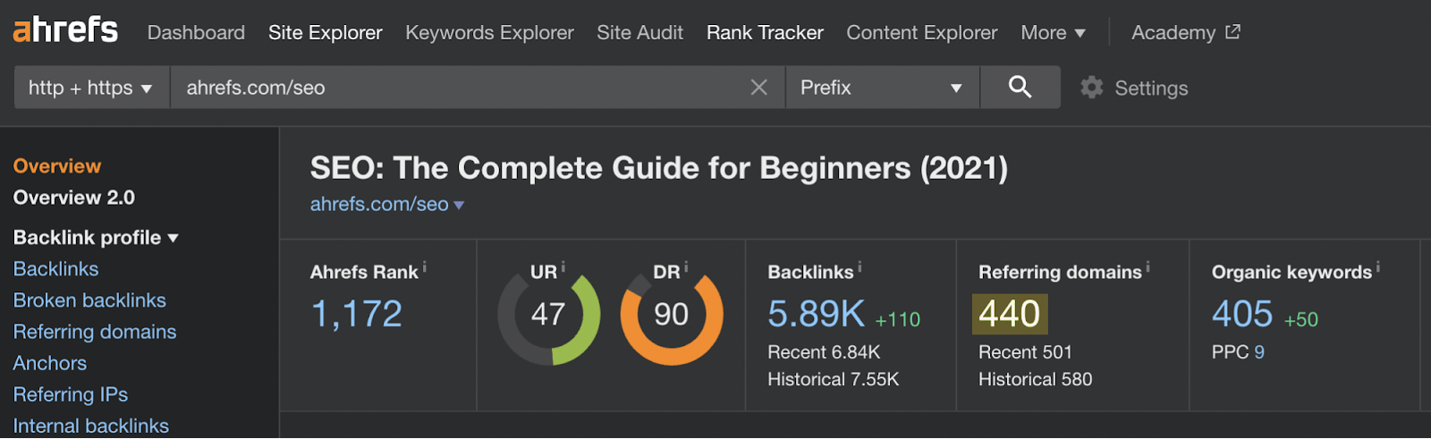 首先,将你试图排名的网页的 URL 插入 Ahrefs 的网站分析,你就会看到你的网页当前有多少外链和引用域名(链接网站)。