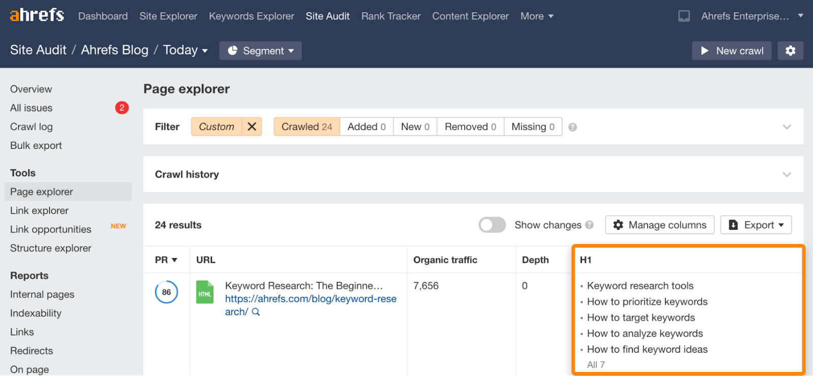 你可以在 Ahrefs Webmaster Tools(Ahrefs站长工具)中免费检查你的网站上是否有带有多个 H1 标签的页面。