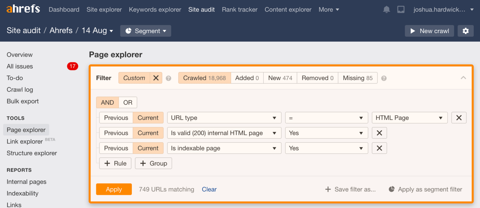 一旦抓取完成,可以前往页面分析(Page Explorer)板块,添加以下过滤条件。
