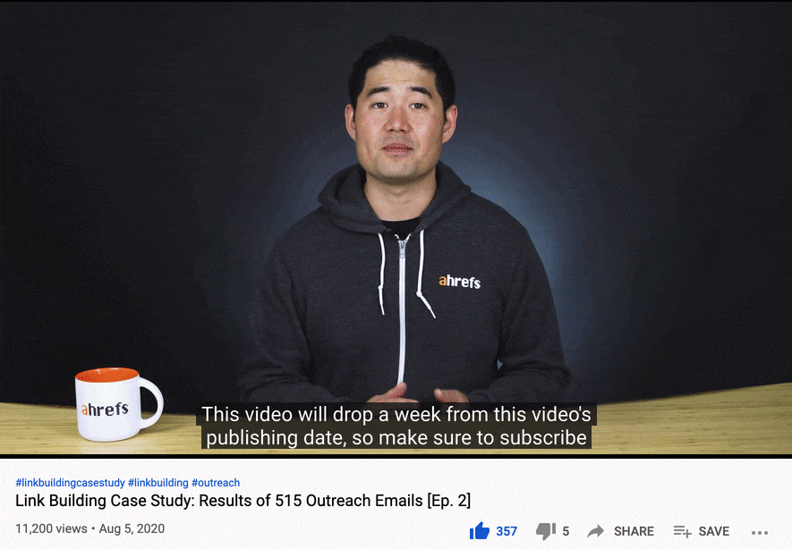 但我们并不仅仅局限于我们能控制的资产。 例如,当营销团队的某个人在播客(或演讲)采访时,主持人询问他们的听众能从哪里学到更多关于我们的信息,我们经常告诉他们在Youtube上搜索Ahrefs。 当然,播客主持人也会链接到我们的YouTube频道从我们讨论这个起。