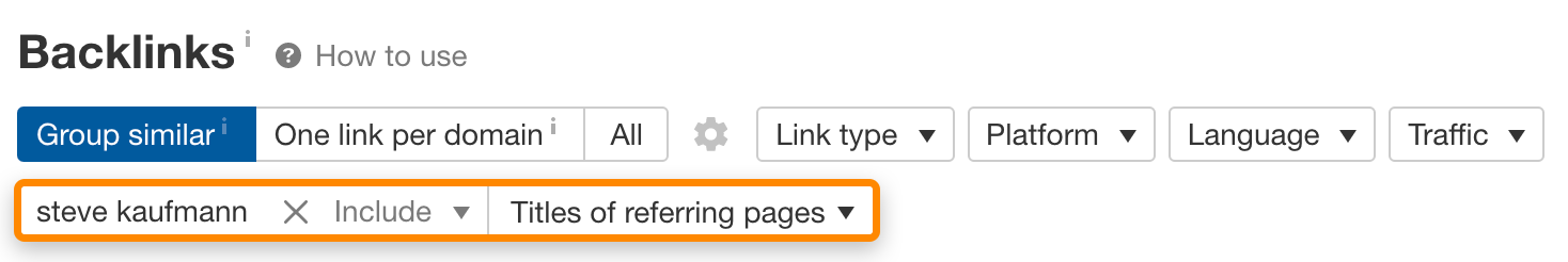 在 Ahrefs 的网站分析中输入他的网站,进入外链报告,并在“包含”框中搜索他的名字。将其设置为搜索“反链页面标题”。