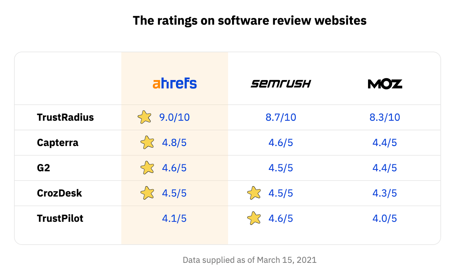 对于我们的对比页面,我们没有进行并排比较,而是决定使用来自中性评论网站的评级。
