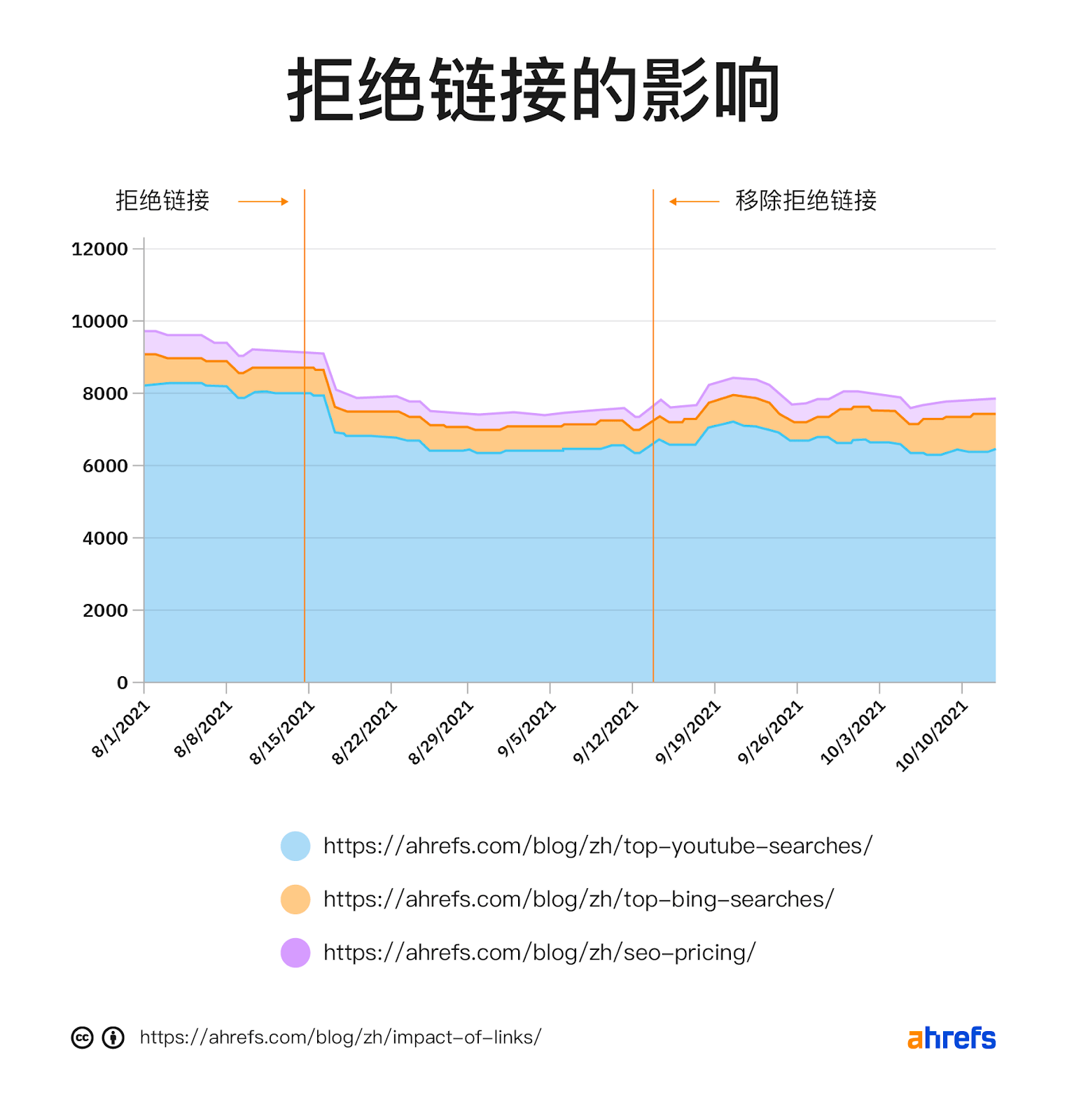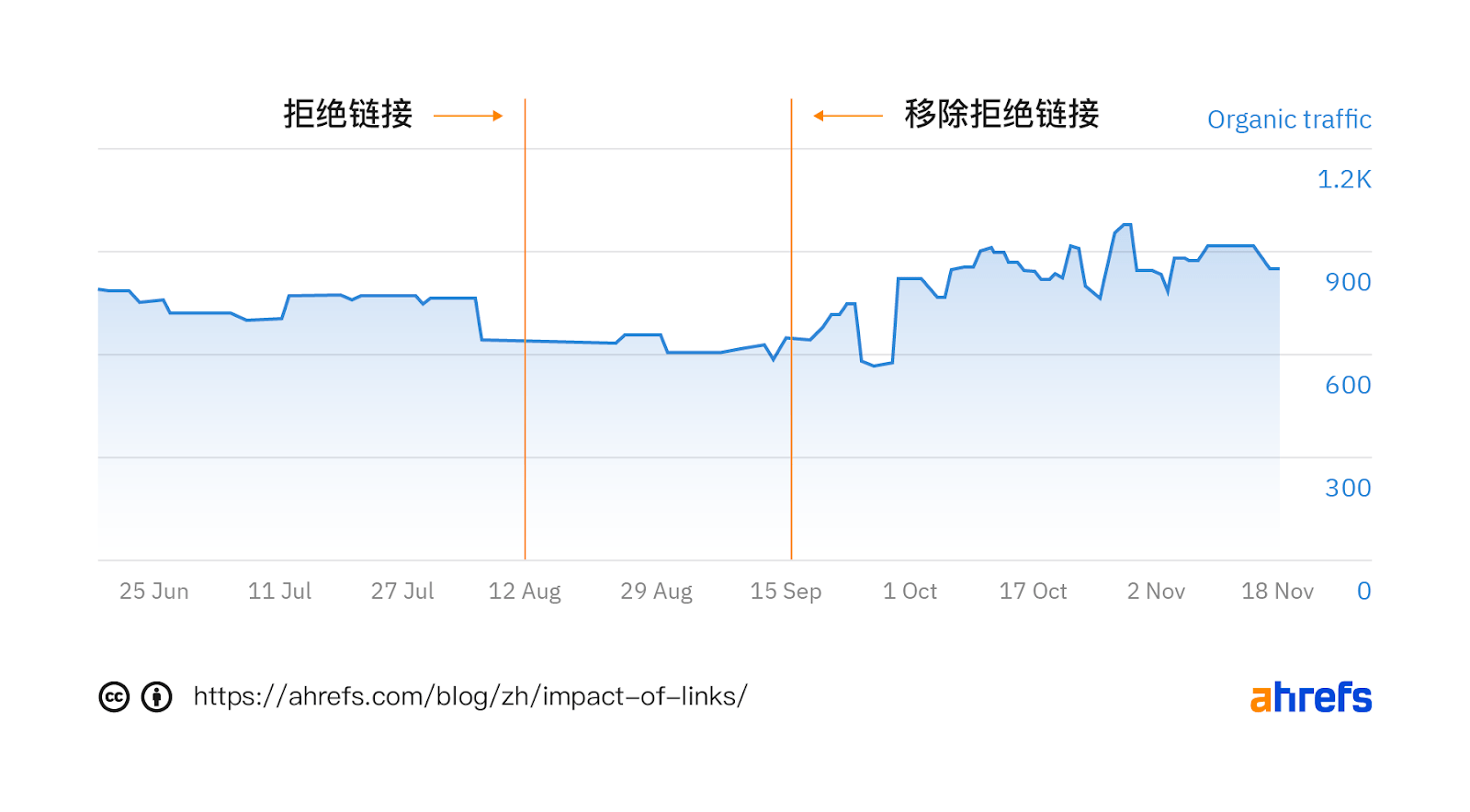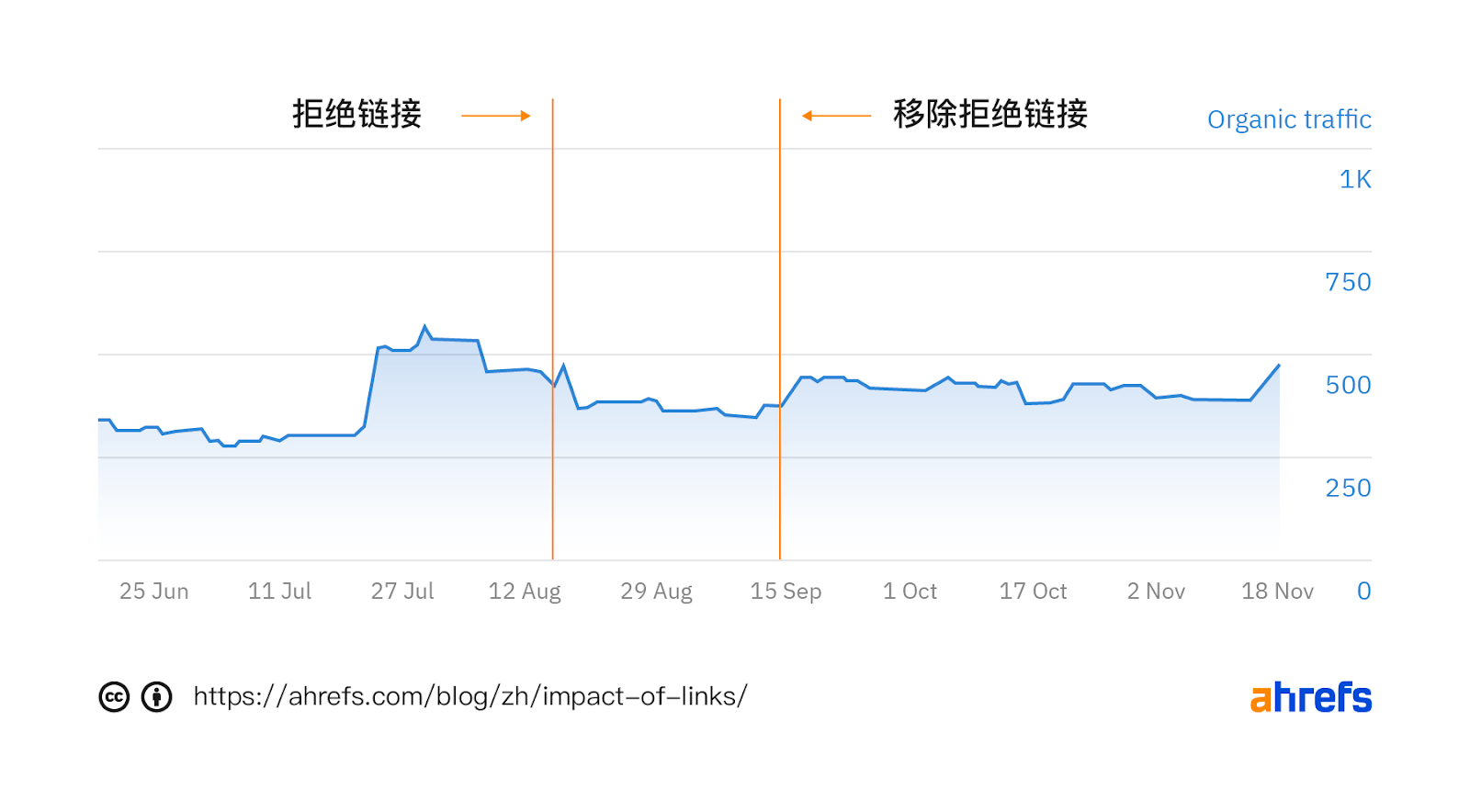 看看当我在8月17日上传拒绝文件时立即流量下降的情况。这种下降趋势持续了一段时间,因为链接到这些博客的页面越来越多。您还可以看到立即解除时,9月14日我删除了拒绝文件。我怀疑这种直接的影响,是因为更有价值的链接可能出现在更高的 PageRank 和更频繁的爬行的页面上。