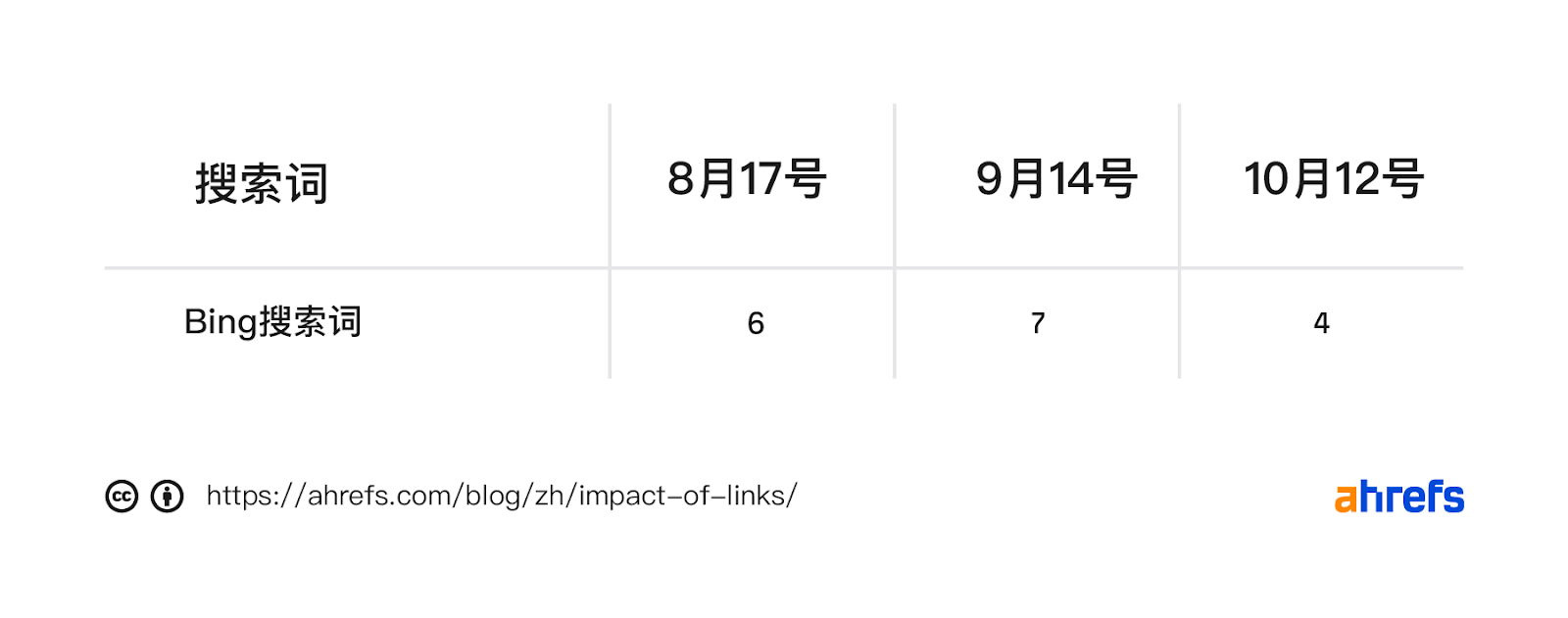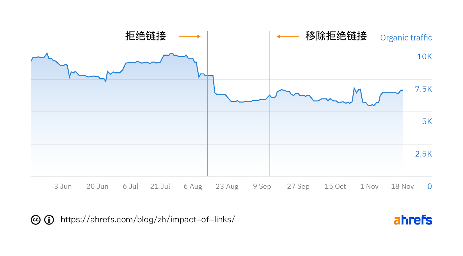 上面的图表显示了 Ahrefs 的平均自然流量,这是一个稳定的衡量搜索可见性的指标。它根据排名和网页排名中所有关键字的预期点击率来估算流量。