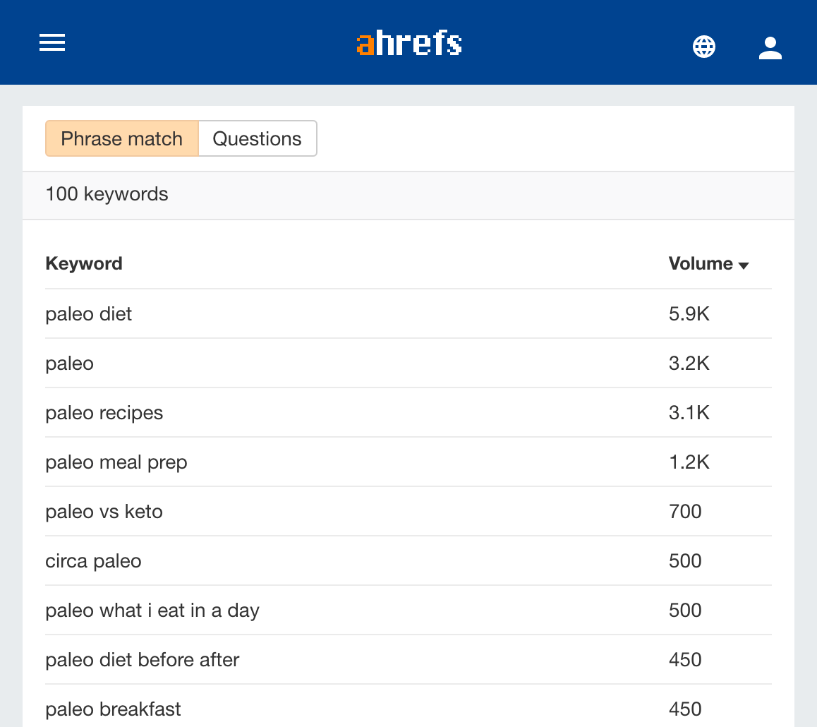 要查找这些主题,请使用关键词工具。例如,假设你拥有一个关于古饮食(the paleo diet)的网站。在一个免费的关键词研究工具(关键词生成器)里输入一个相关的话题,比如“Paleo (旧石器时代)”,它会提供关键词研究的想法,并告诉你这些话题有多受欢迎。