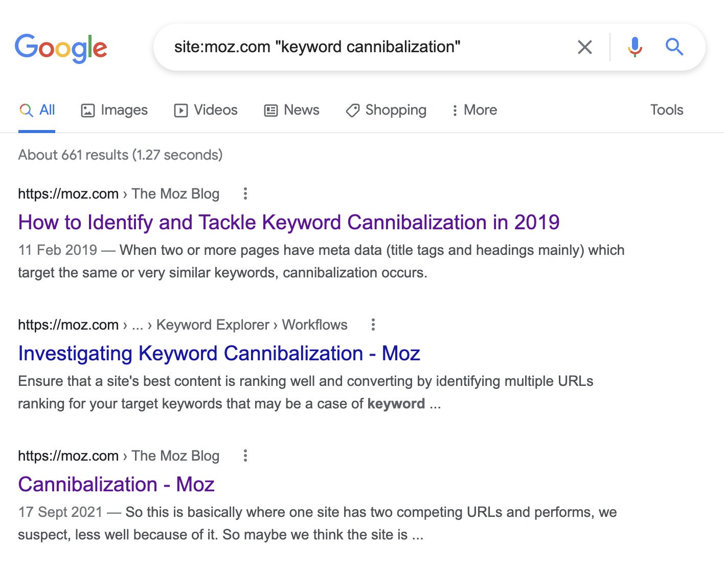 小心这种策略,因为谷歌会返回每一个模糊匹配的结果。 例如,你可以在上面看到我们的搜索有 661 个结果。 Moz 在这里很可能存在关键词蚕食问题,但并非所有这些页面都有问题。其中大多数页面其实都针对了完全不同的关键词。