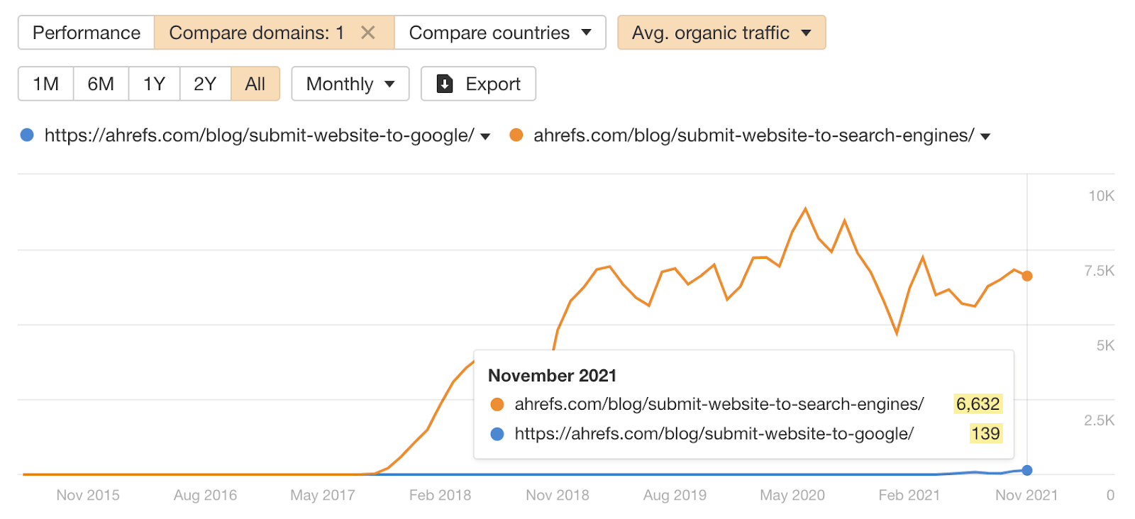 刚才的情况并非真正的蚕食问题,因为这两个页面的存在并不会损害我们网站的整体的自然流量获取性能。 如果我们要合并或删除其中一个,我们可能会失去一些其他关键词排名,并看到整体流量的下降。