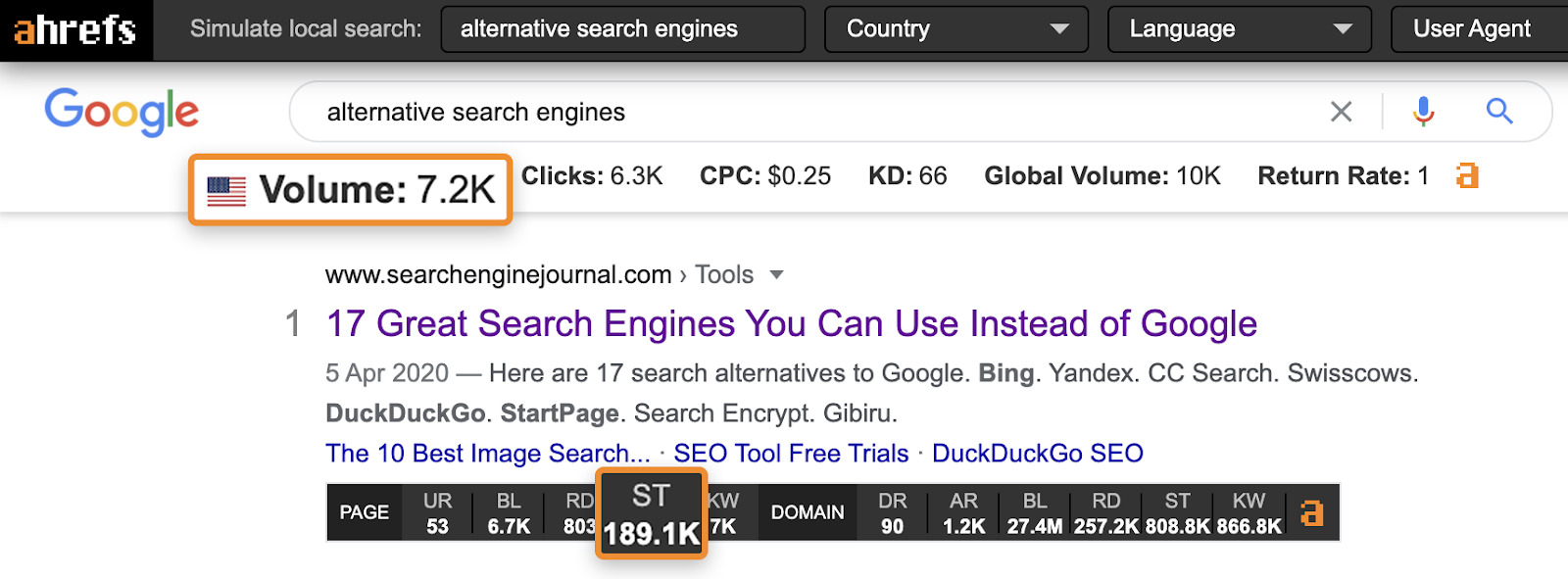 在 Ahrefs,我们有一个称为域名评分(DR)的指标,它代表了一个网站的权威,基于其外链配置文件的强度。这并没有计入我们的 KD 分数,但是,作为一般规则,你可能会发现如果一个关键词的最高结果来自比你的 DR 分数高得多的网站很难排名。