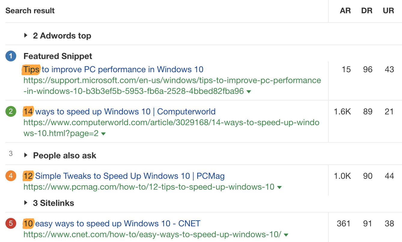 例如,所有“加速 windows 10”的结果都是列表式的博客文章,而“ corsair k70”的结果都是电子商务商店的产品页面。