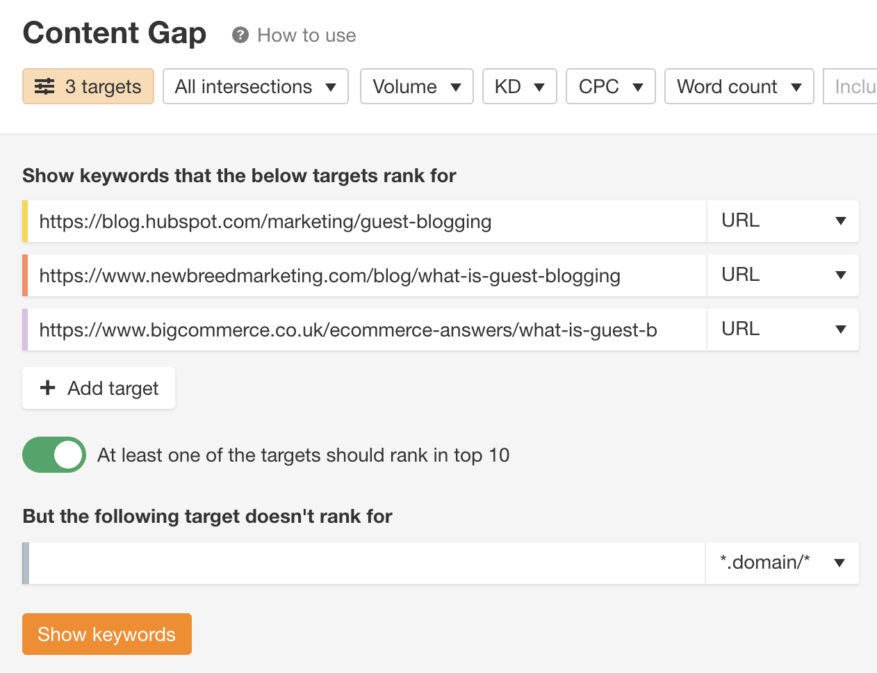 内容差距机会工具可以找到其他网站排名的关键词,但您却找不到。 大多数大型SEO工具都有一个,但是当您阅读Ahrefs博客时,我们将用我们的工具进行演示。