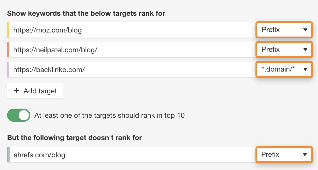 如果你只想查看竞争对手在他们网站的特定部分排名的关键词,那么输入一个子域名或二级目录。例如,如果我们为 Ahrefs Blog 运行一个关键词竞争分析,我们可以插入竞争对手如 Backlinko 和 Moz。但是由于我们只对博客内容感兴趣,我们希望分析 moz. com/blog 而不是 moz. com,因为他们所有的博客 post url 都包含这个前缀。