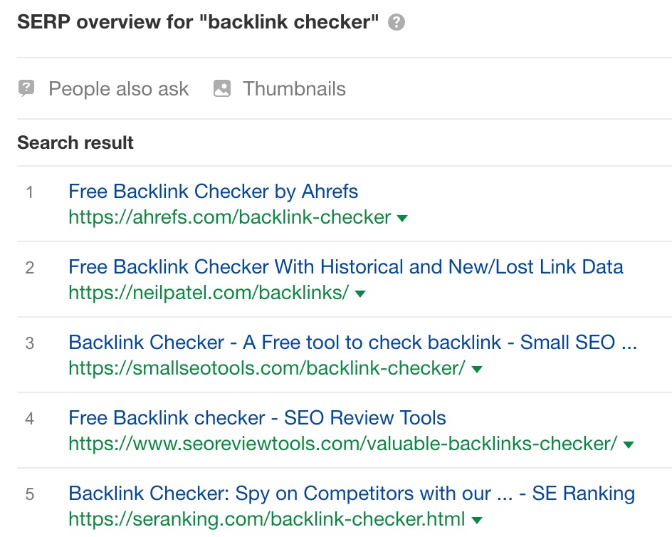 让我举个例子。与其试图弄清楚关键词 “backlink checker” 是是属于哪个类别的,不如看一看该关键词的实际排名靠前的网页,并分析搜索者从它们那里得到了什么,这样会更有成效。