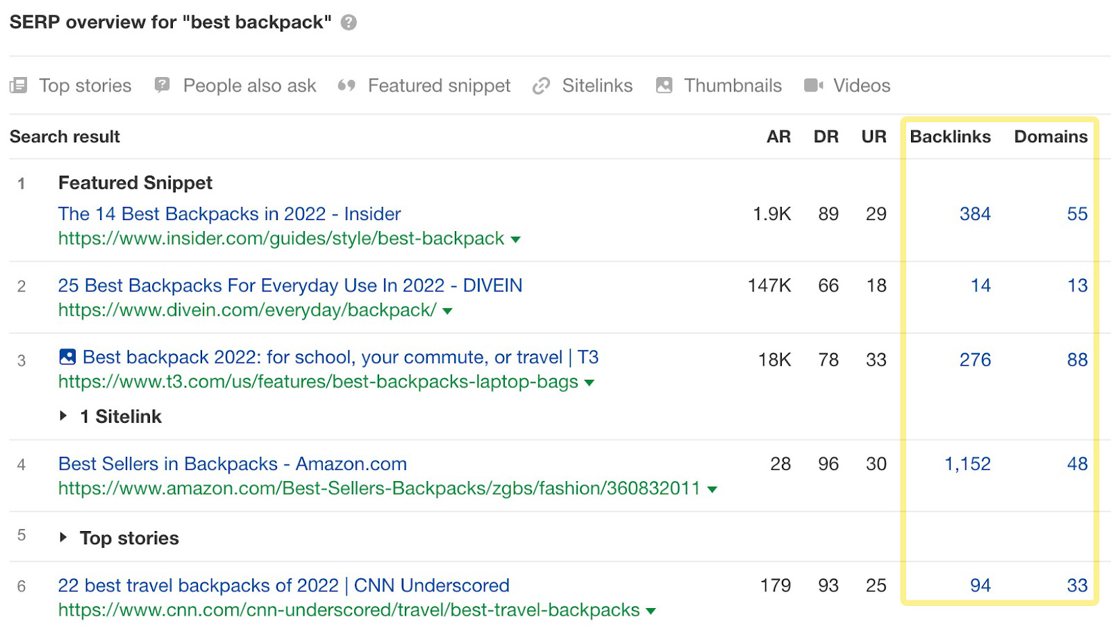 Keywords Explorer(关键词分析)中,我们为此创建了一个方便的快捷方式,“SERP概述” 中的每个数字都链接到 Ahrefs Site Explorer(网站分析)中各自的反向链接报告: