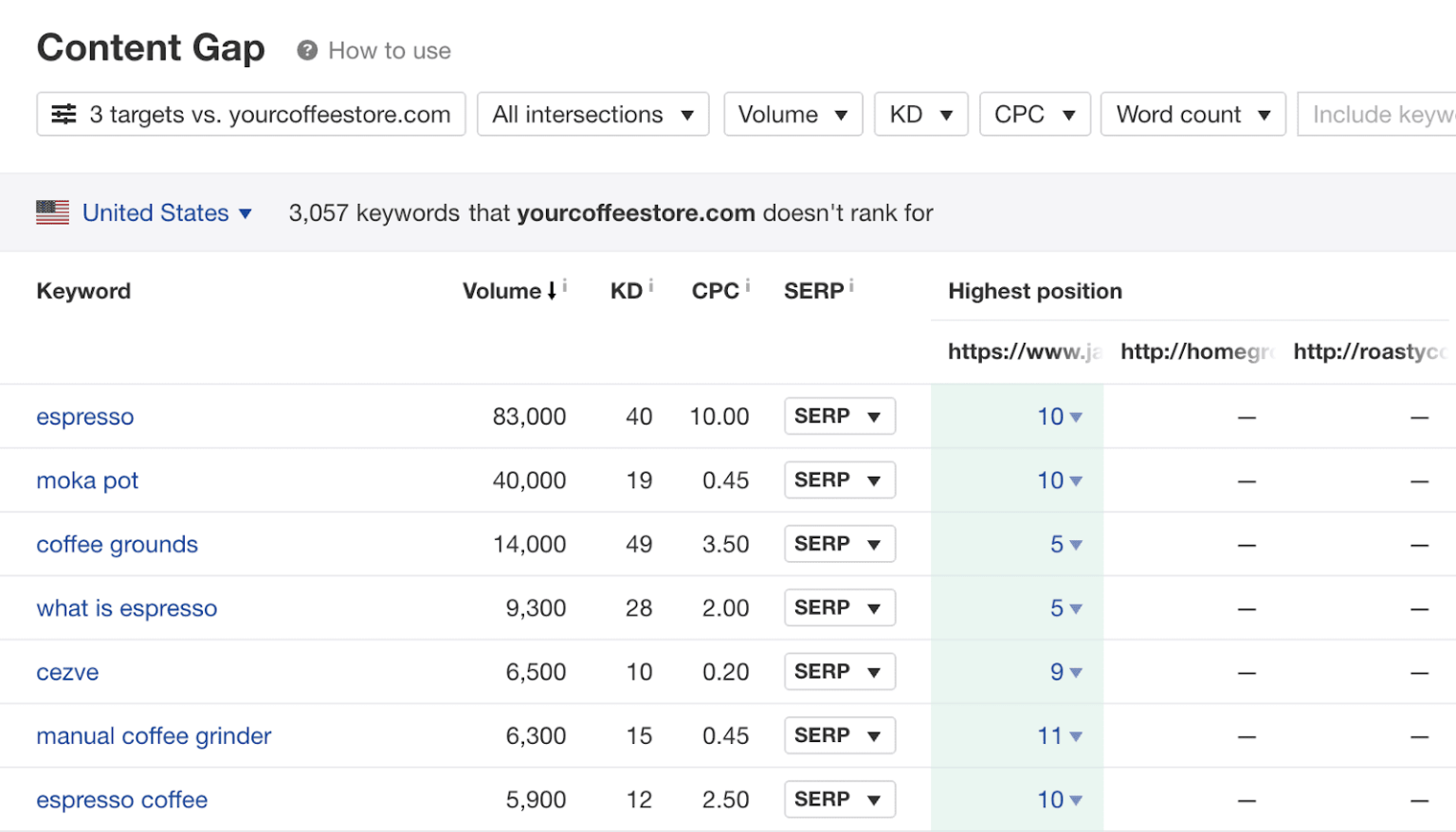 我们通过使用 Site Explorer(网站分析)分析了一个竞争网站,为我们假设的咖啡店发现了一些有趣的关键词: