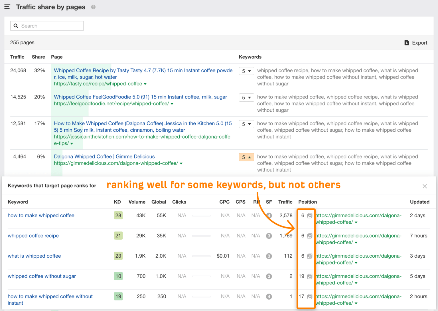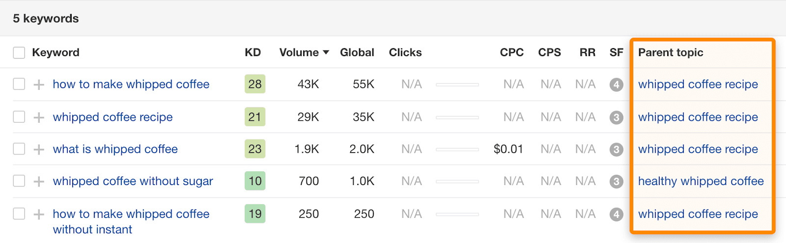 我们在这里看到的内容反映了我们在搜索结果中看到的内容。 我们的大多数关键词都属于同一主题。 唯一的例外是 “whipped coffee without sugar”,因此这需要单独做成一页。