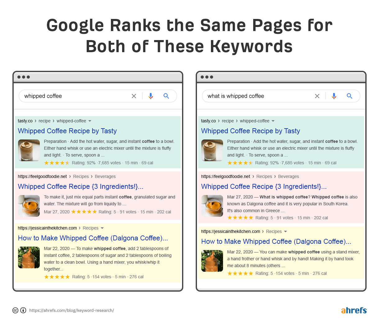 例如,我们在 “how to make whipped coffee” 和 “what is whipped coffee” 中看到一些相同的结果页面。