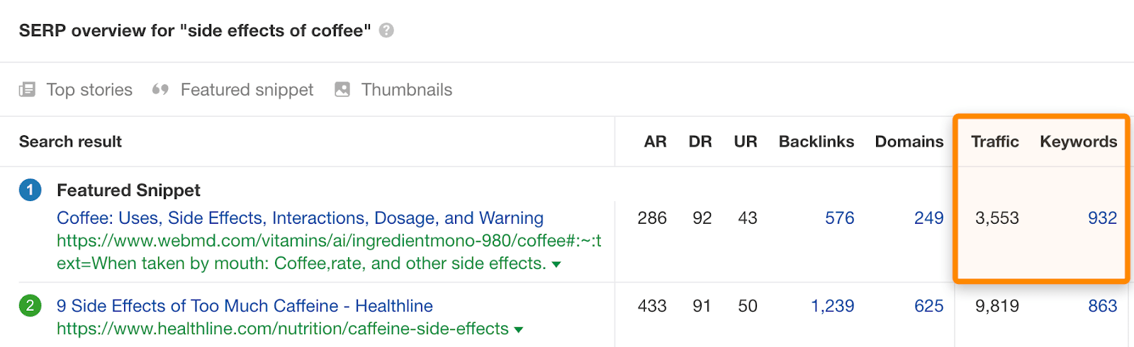 在这里,我们看到“side effects of coffee”的排名最高的页面估计每月获得约3500次访问,并参与了930个以上的关键词进行排名: