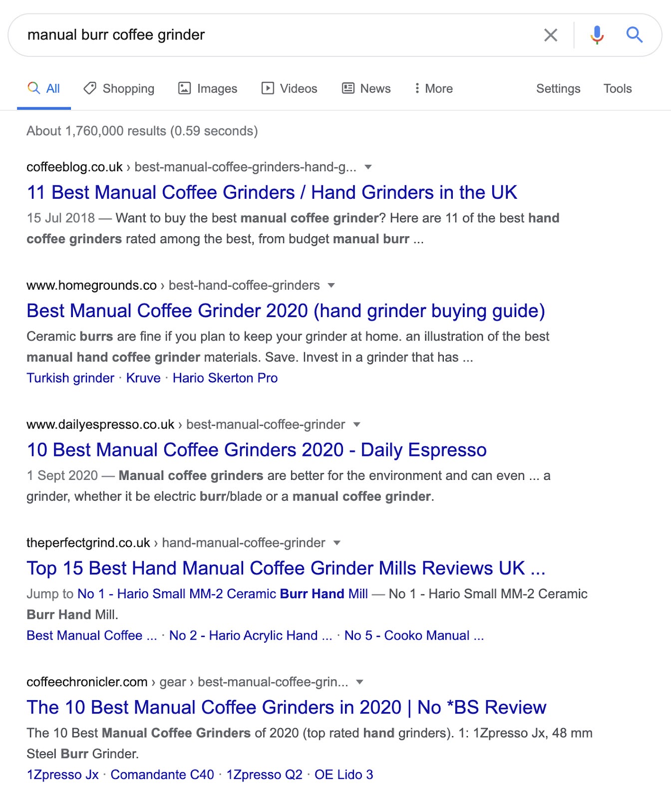 但是,像 “manual burr coffee grinder” 这样的关键词呢? 你是使用博客文章、还是显示你所销售的研磨机产品列表页呢?