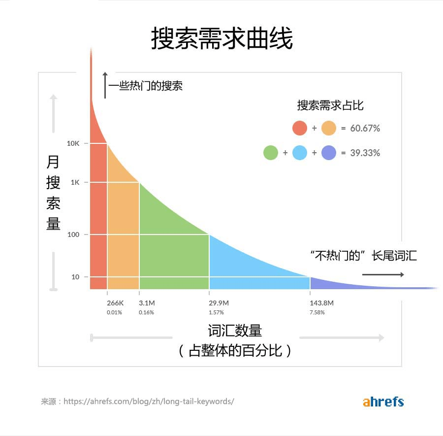 长尾关键词是指搜索量低的关键词。 它们之所以这么叫它,是因为它们位于所谓的“搜索需求曲线”的最末尾上: