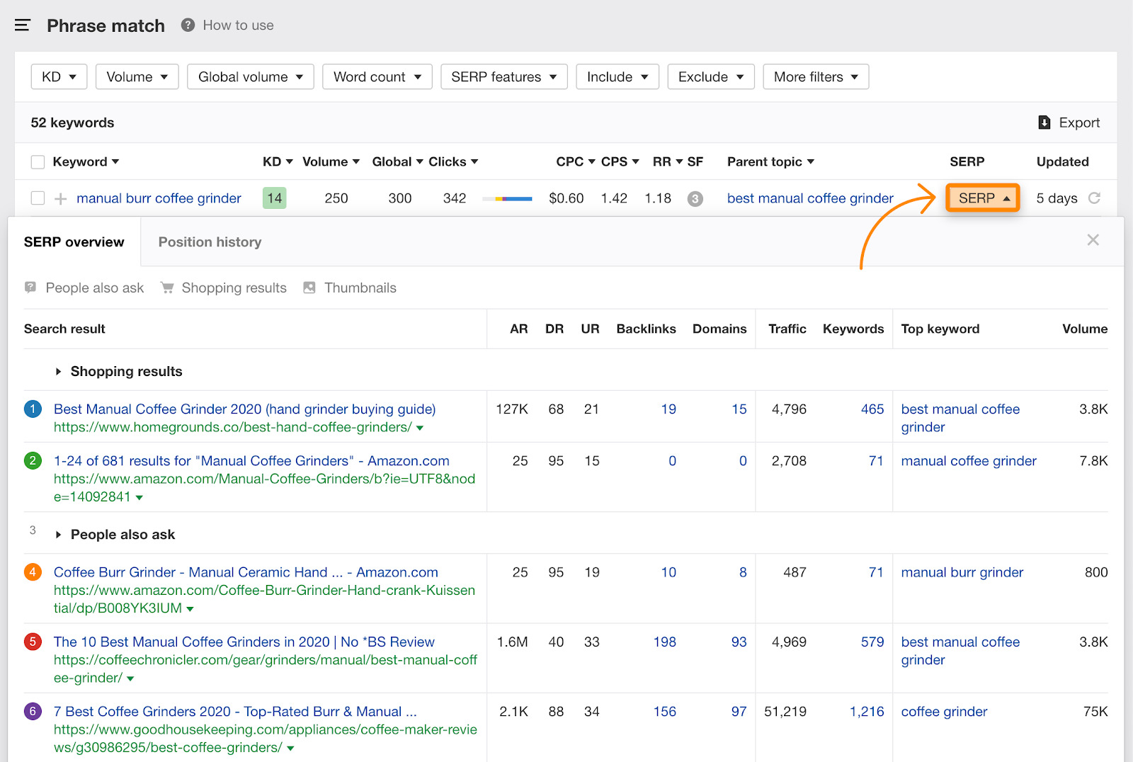 Ahrefs Keywords Explorer(关键词分析)中 “coffee grinder” 的 SERP概览