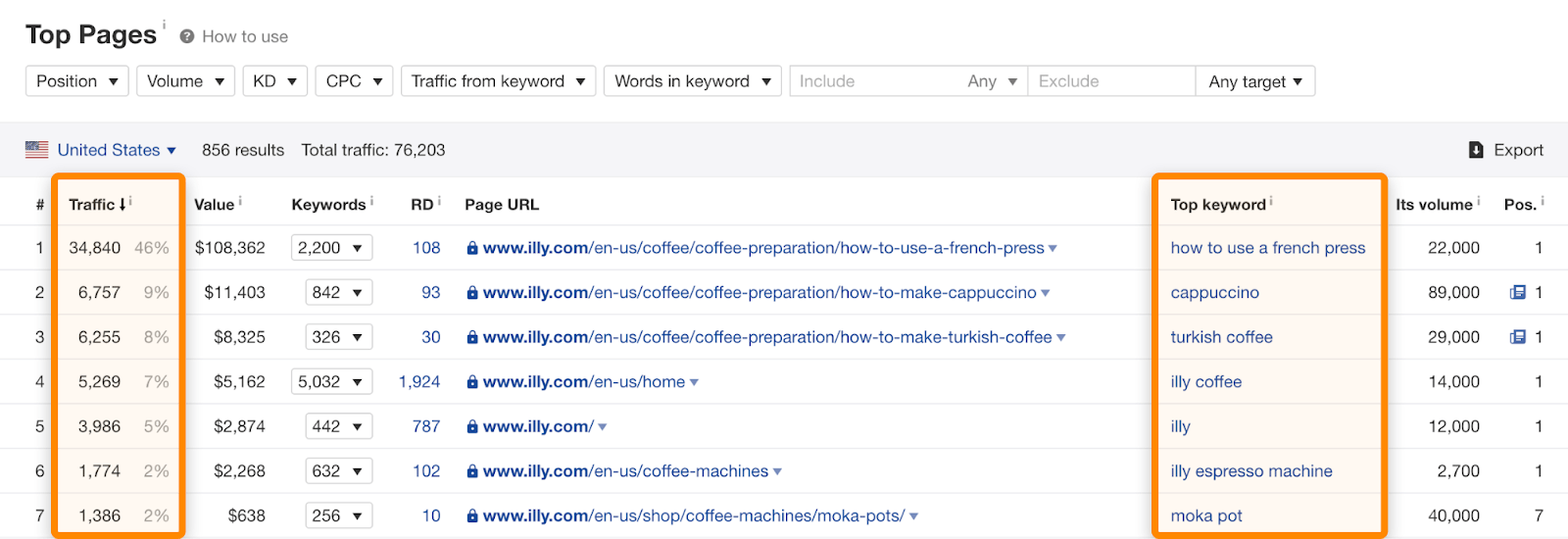然后,你可以将这些网站依次放入 AhrefsSite Explorer(网站分析) ,并查看Top Pages(热门页面)报告。这里会显示他们获得流量最多的页面。同时它还会展示出这些页面获得流量最多的关键词是什么。