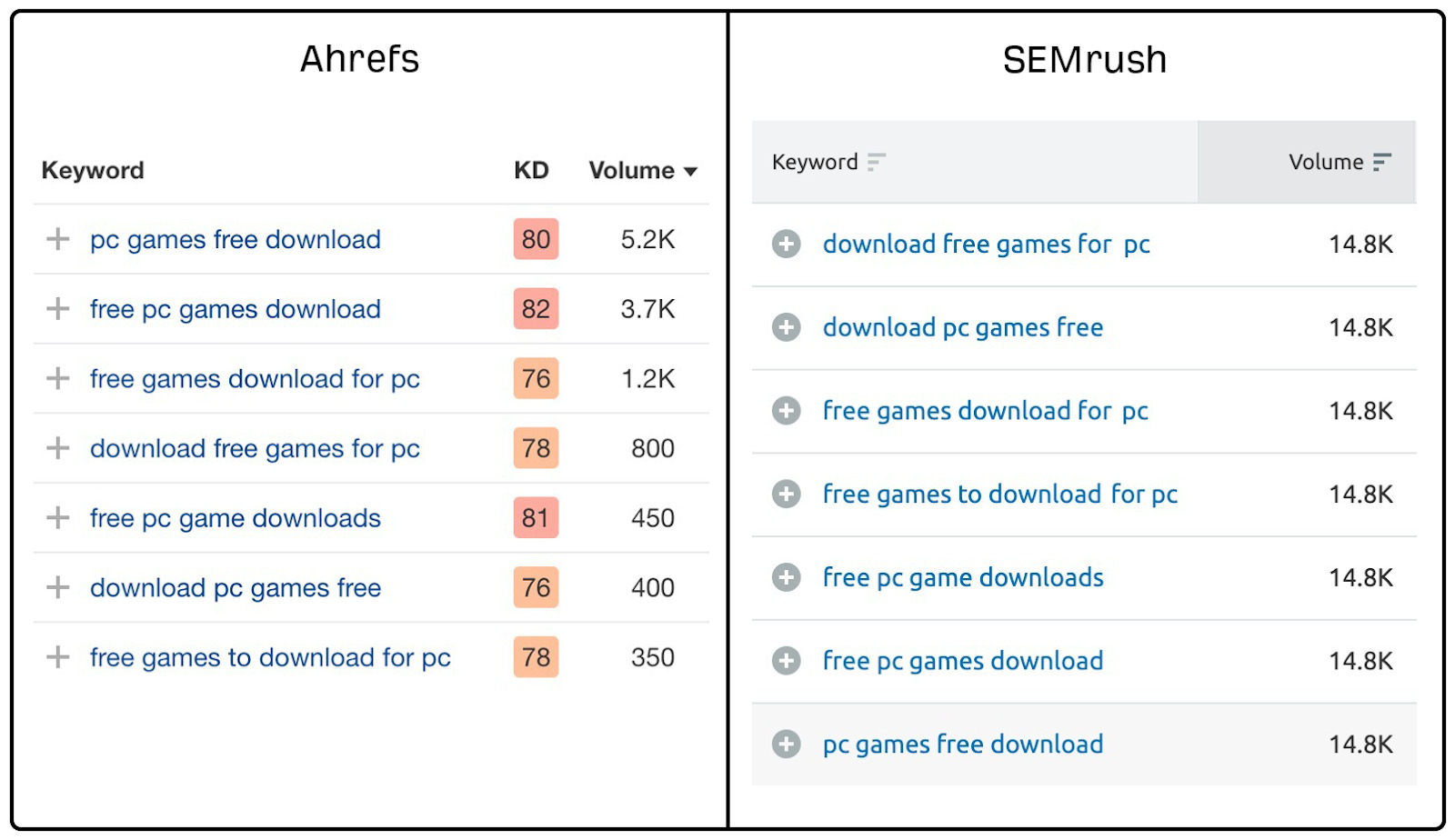 大多数 SEO 工具都会模仿这种行为,因为它们是从 GKP 获取搜索量。 因此,他们将为这些关键词变体中的每一个显示相同的搜索量。
