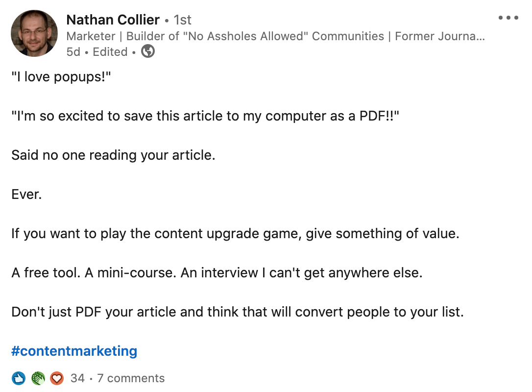 Sumo通过提供免费下载奖励内容来捕获潜在客户。 在营销世界中,我们称之为“内容升级”。它可以是工作表,模板,清单等 但是,注意,你不能只是随便附加一个奖励内容。仔细看,你会发现Sumo都是提供和读者刚读的那篇文章相关的内容升级 。在“如何写时事通讯”的帖子中,Sumo提供了一个非常适合时事通讯想法的滑动文件。 当然,你也可以提供一些更简单的东西,比如文章的PDF版本,但这不是一个很有吸引力的方法。理想情况下,如果你想赠送一些非常有价值的东西,注册是一个非常好的选择。 正如我的朋友 Nathan Collier写道: