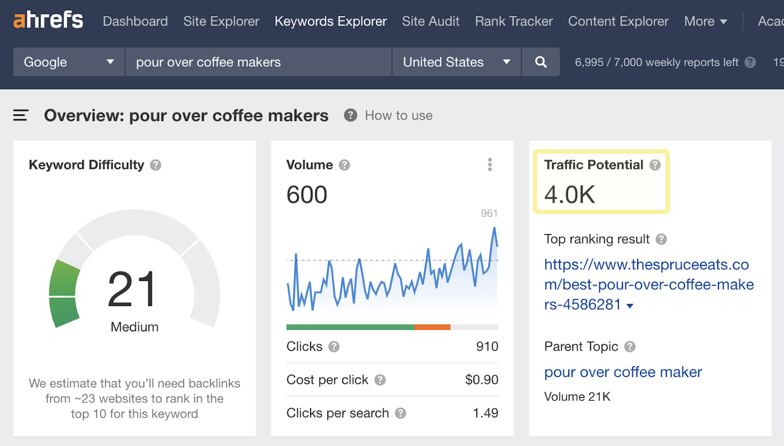 你也可以看看搜索量,但“流量潜力”往往更准确。这是因为页面排名通常不止一个关键词。