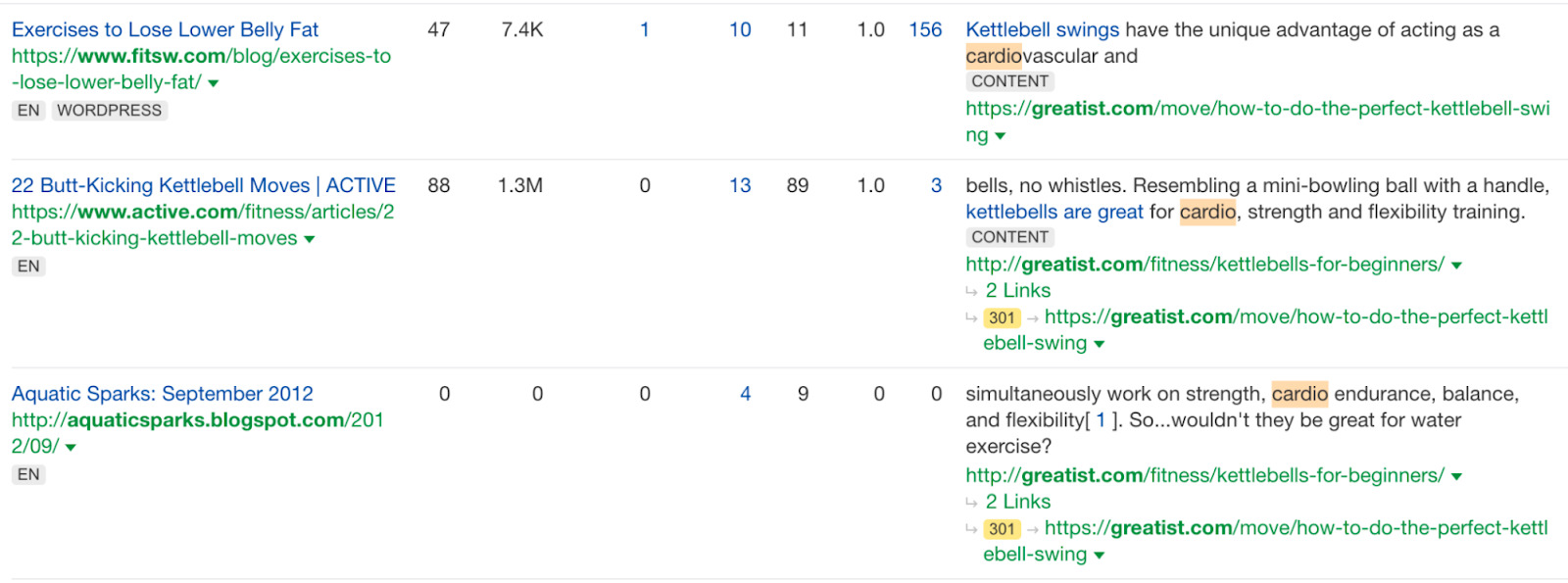例如,如果我们为 Greatist 中关于 “perfect kettlebell swing” 文章做这件事,我们看到有不少人链接,因为帖子中提到了它的好处/优点。