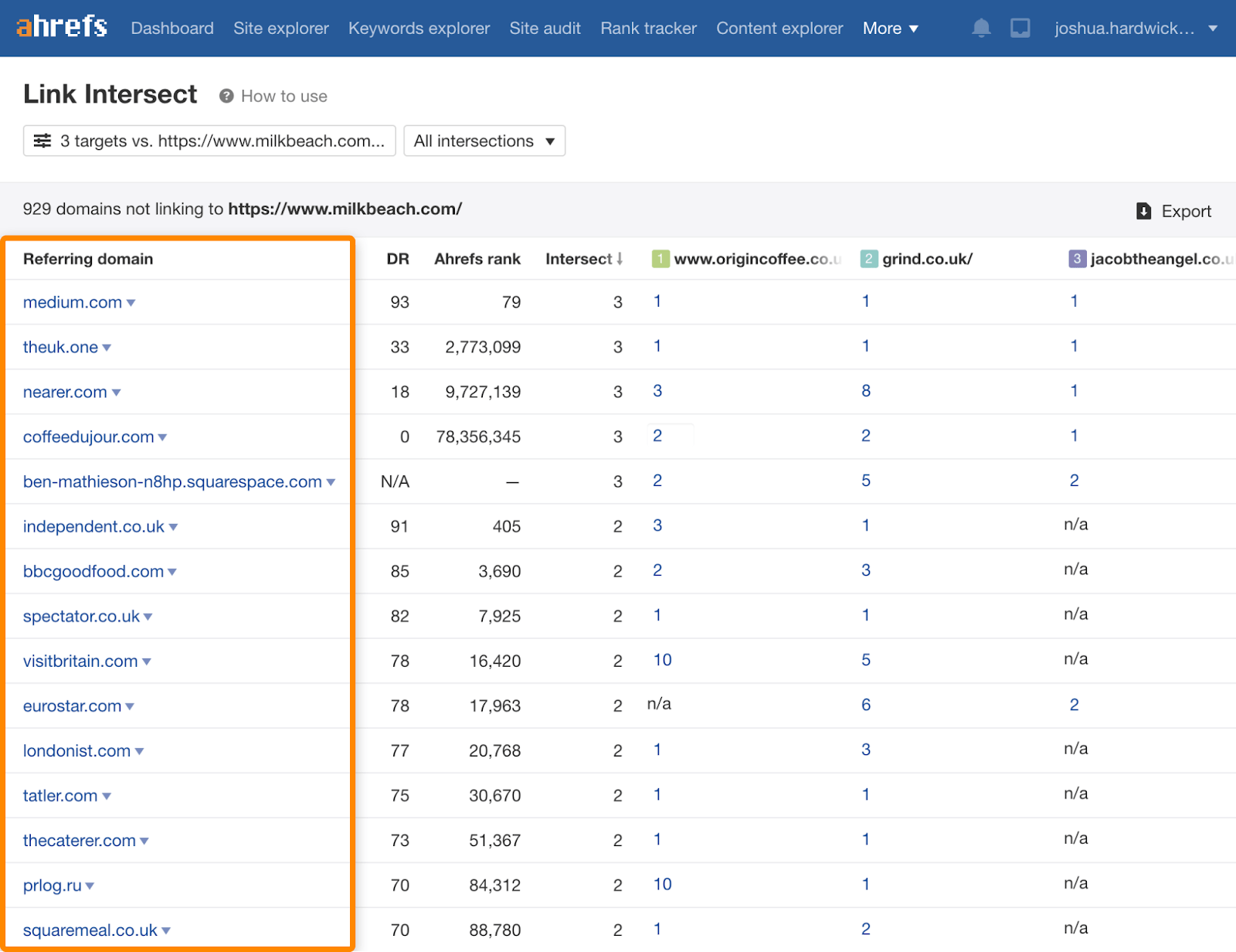 c) 使用 Ahrefs 的交集外链分析工具(Link Intersect tool)