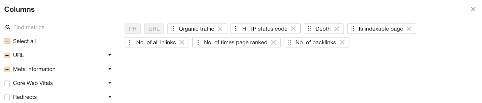 由于我们从日志文件和 Ahrefs 的网站诊断中添加了数据,因此发现这些 URL 很简单。