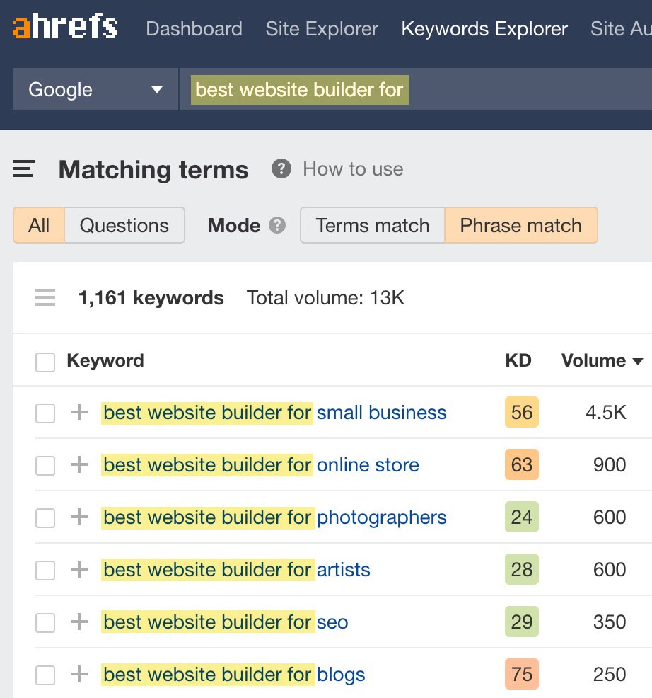 回到我的 “best website builder for __” 关键词示例。 在 Ahrefs Keywords Explorer(关键词分析)中搜索会返回一千多个结果:
