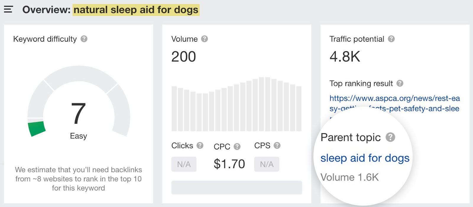 父主题表明这个长尾关键词只是搜索词 “sleep aid for dogs”(1.6k 搜索)的变体。