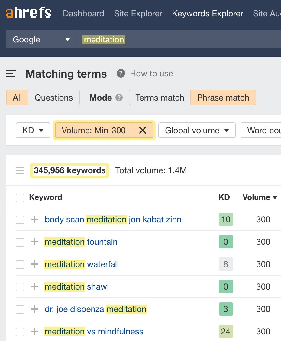 与前一种不同,这种方法不需要任何繁琐的手工工作。 只需在 Keywords Explorer(关键词分析)中搜索定义你的利基的任何单词,然后使用搜索量过滤器即可立即查看数以千计的长尾关键词。