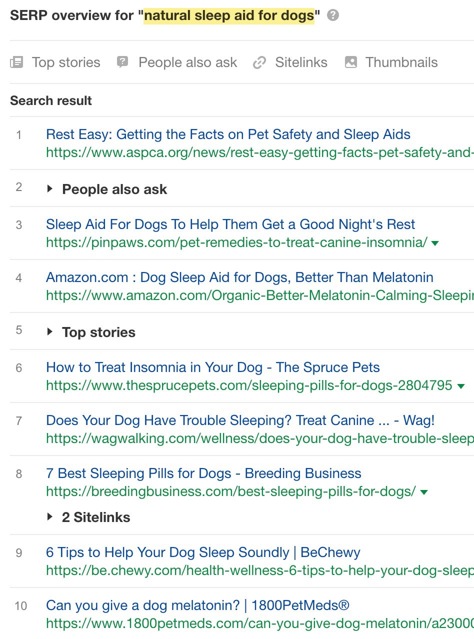 所以我认为创建一个专门的内容来定位关键词 “natural sleep aid for dogs” 确实是有意义的。 在没有涵盖该特定主题的任何其他文章的情况下,它很有可能实际上在该查询中排名第一。