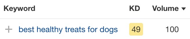 让我用一个例子来解释它。 “Best healthy treats for dogs” 绝对是一个长尾关键词,因为它每月只有 100 次搜索: