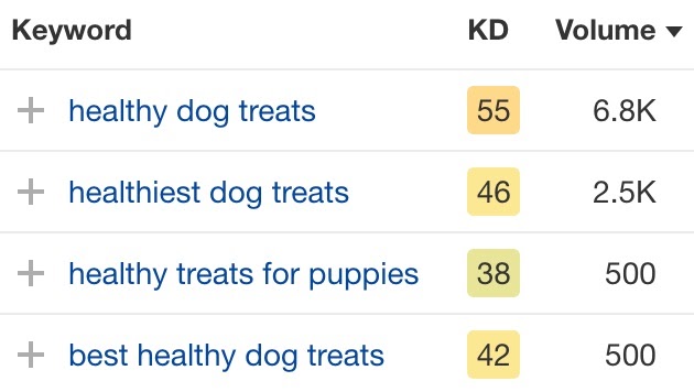 正如你在上面的屏幕截图中所见,这个长尾关键词有一个更受欢迎的变体:“healthiest dog treats”(2.5k 次搜索)。 如果你设法为该搜索词排名,你也会自动为其支持型长尾关键词排名。