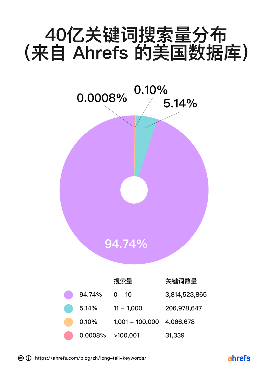 准确地说,在 Ahrefs 的美国地区数据库(顺便说一下,这是业内最大的)中,每月搜索量超过 10 万次的关键词只有 31,000 个; 另一方面,每月搜索不到 10 次的关键词有 38 亿个。