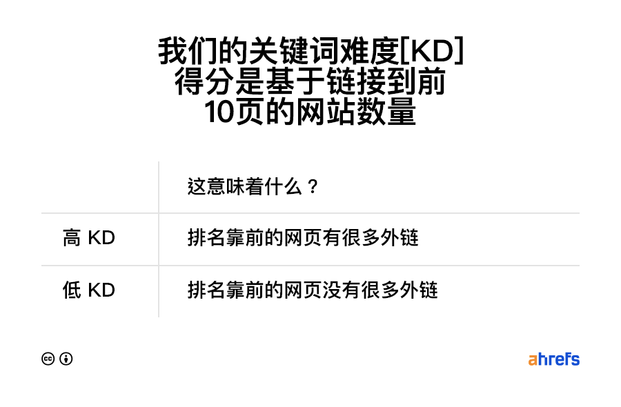 鉴于外链可以说是最重要的排名因素,我们的关键词难度评分通常是排名难度的一个不错的代表。如果一个关键词在 Ahrefs 的 KD 分值很低,那就是“低竞争”,也就是说你可能不需要建立或获得很多外链来参与竞争。