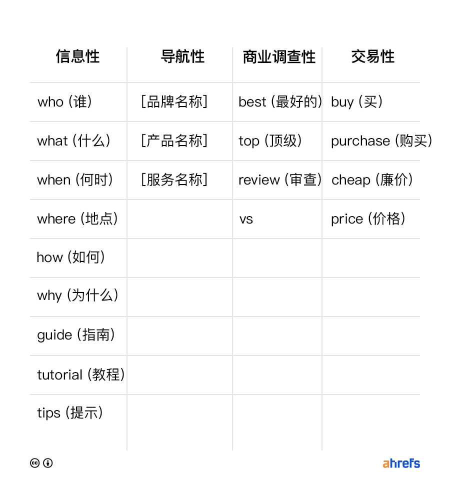 通过查找查询中的关键词修饰语,您通常可以知道您的关键词属于哪个类型。如果它包含诸如“买入”或“便宜”之类的词,那么它很可能是一个交易性查询。如果它包含诸如“how”、“waht”或“where”这样的词,那么它可能是一种信息。