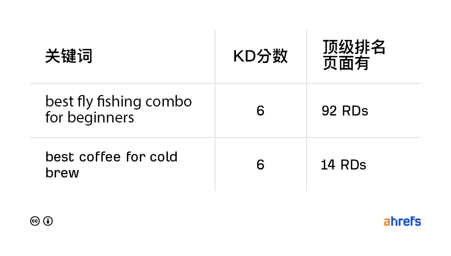 总之,在其他条件相同的情况下,使用92个 RDs 的页面可能比使用14个 RDs 的页面更容易超过页面。因此,尽管 KD 分数相同,“best coffee for cold brew”可以说是一个竞争力不如“best fly fishing combo for beginners”的关键词