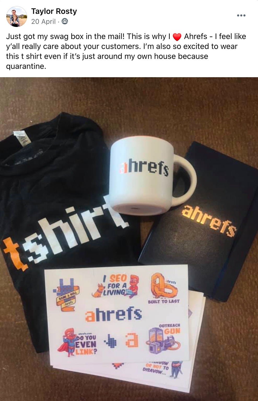 但在这里,我们并不是要评判他的舞蹈能力。重要的是他和舞伴穿着 Ahrefs 的 T 恤,这意味着他正在为我们的品牌打广告和背书。