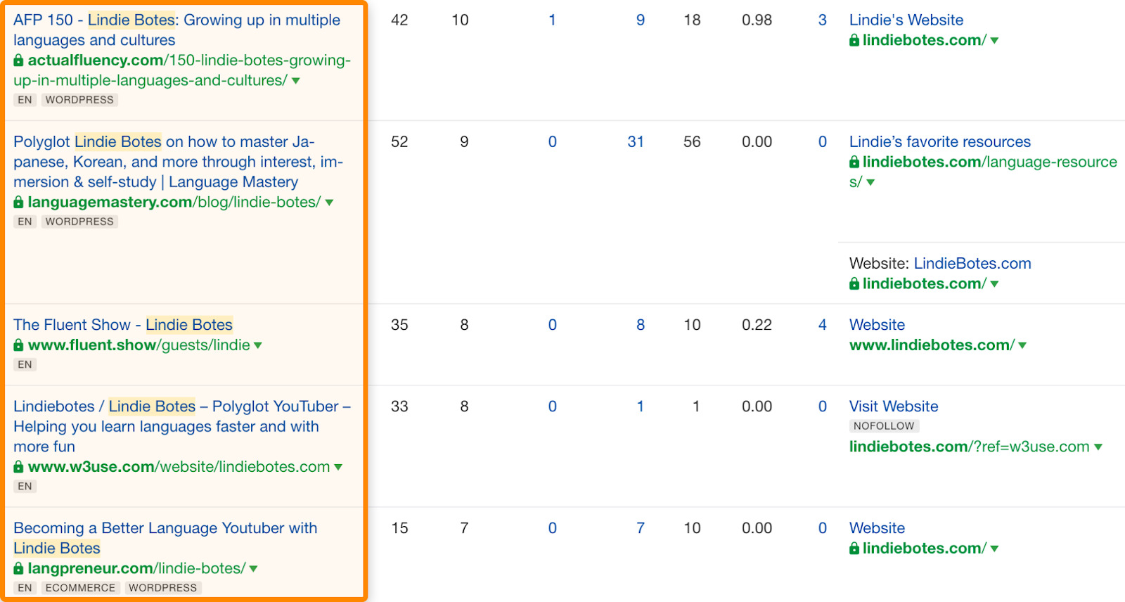 例如,Lindie Botes 在语言学习领域的多个播客中亮相。只需要将她的网址粘贴进 Ahrefs 的 网站分析 工具,前往外链报告,在“包含”字段中键入她的名字,并将目标设置成“引介页面的标题”,就可以找到几乎每一个她参与的播客。