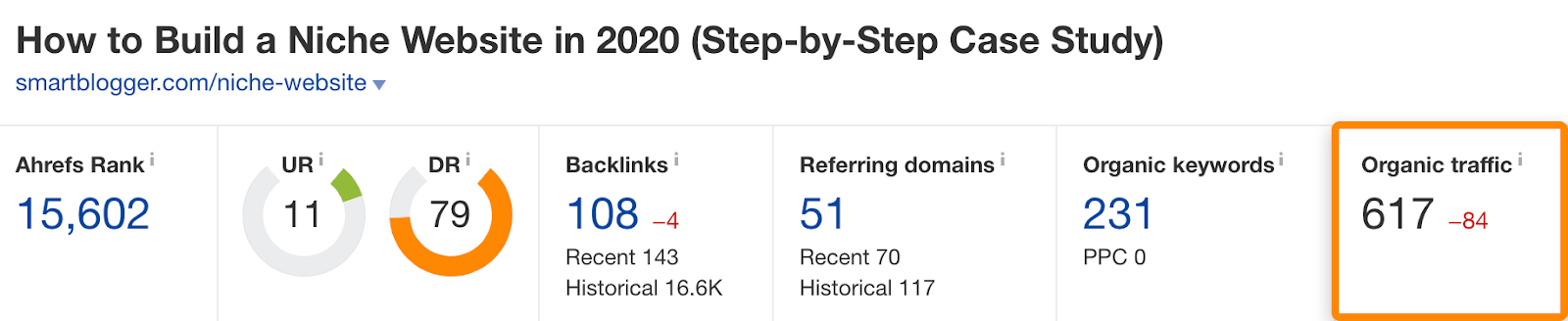 例如,两年前我为 SmartBlogger 撰写了一篇客座文章。如今,这个页面在 Google 依然之于 231 个关键词有较高的排名,且估计每个月可以带来 ~ 600 次自然搜索访问。