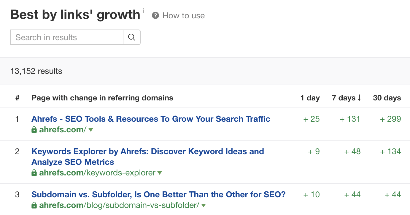 使用 Best by Links Growth(按链接增长速度排序)报告,我们可以查看在过去 1天、7天、 30天内哪些页面获得了或丢失了外链: