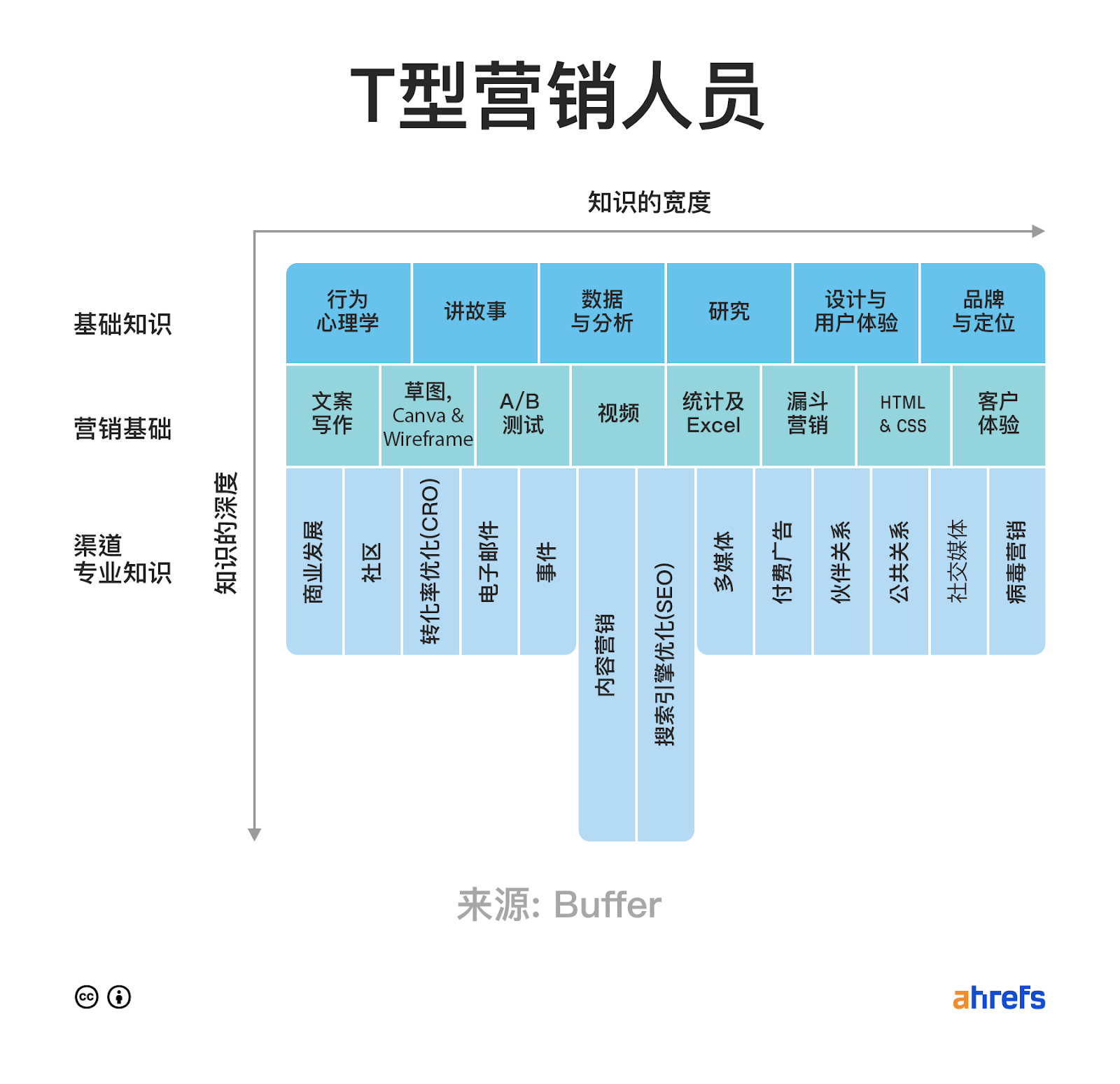关于市场营销技巧的讨论最终碰到了这样一个话题: 你应该是一个专家还是一个通才? 就像关于你应该掌握哪些营销技巧的争论一样,我不相信有一个“正确”的答案。这取决于你想从你的职业生涯中得到什么。 如果你想在金钱上获得成功,那么成为一名专家可能更好。正如凯文•印迪格(Kevin Indig)所言:建立一个能力圈,专注于为这个圈子服务。 如果你想成为一个管理者,你可以考虑成为一个 T‑型营销者。这意味着你拥有广泛的营销技能/知识,但在某一特定领域表现优异。作为一个专家比一个通才更容易提升你的价值。你可以更快更好地与人们联系,因为这个领域更小。在一件事情上,你可以从深入的知识中更快地获得硬技能,而在许多事情上,你只能从浅薄的知识中获得硬技能。软技能对于这两种职能都是必要的,但对于管理者来说更为关键。这些都是成为一名专家的好理由。