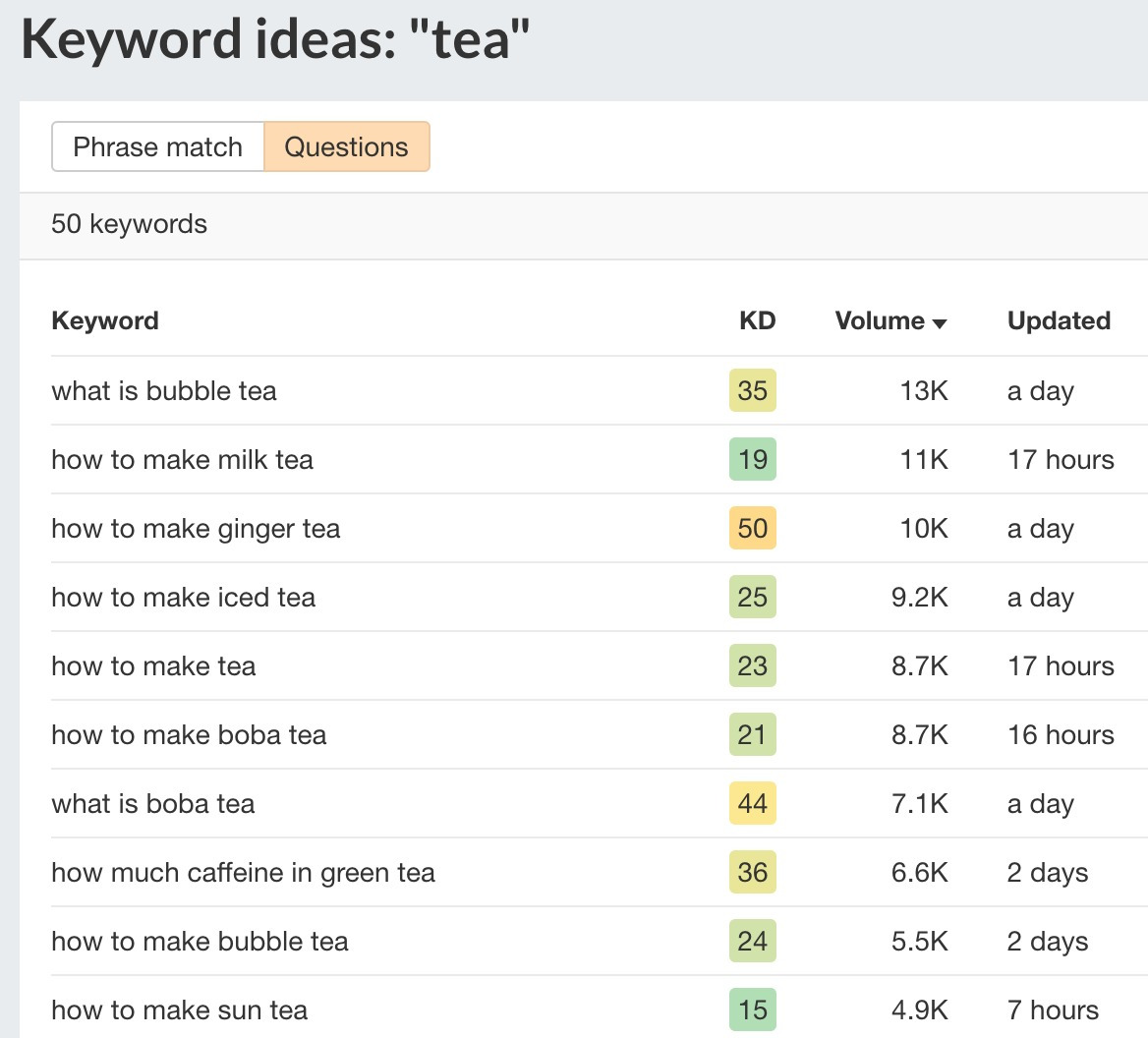 接下来的技巧 # 8应该让你清楚地知道如何进行关键词研究,但是如果你在网上销售茶叶,这里有一个关于如何为你的博客找到主题点子的快速示范: