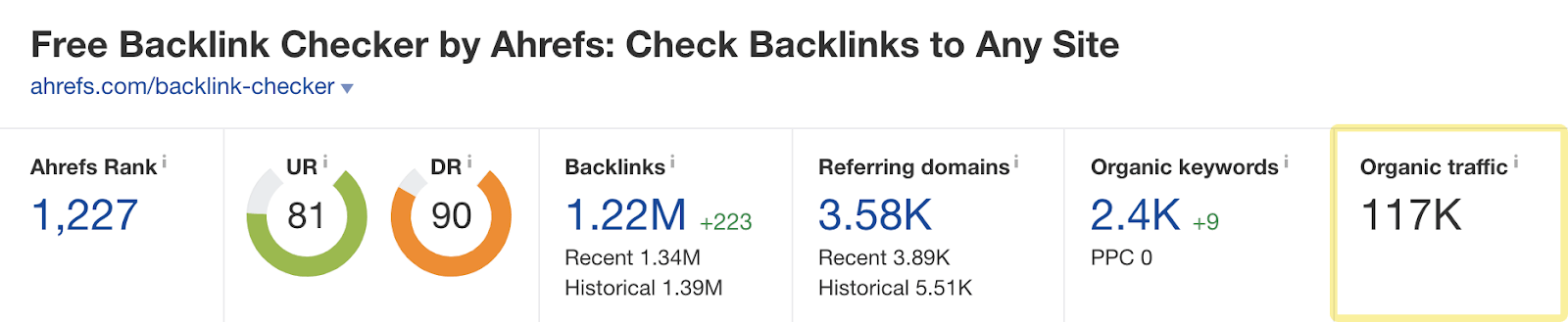 例如,我们有一个免费的外链工具,估计每个月可以吸引117K 的有机搜索访问量: