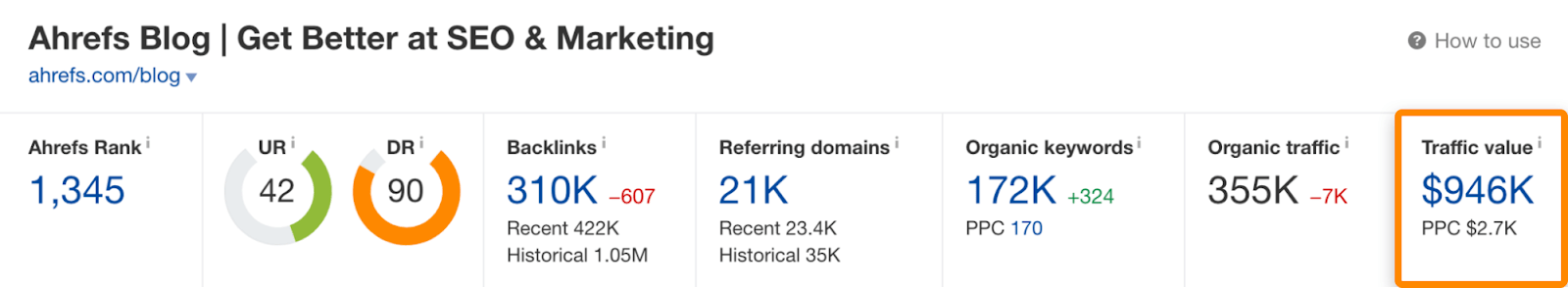 在相关关键词的自然搜索中排名会为你的网站带来免费流量。例如,Ahrefs博客每个月有大概35.5万次的访问,是从自然搜索来的: